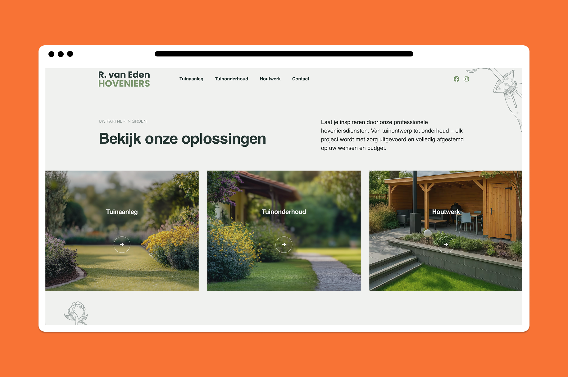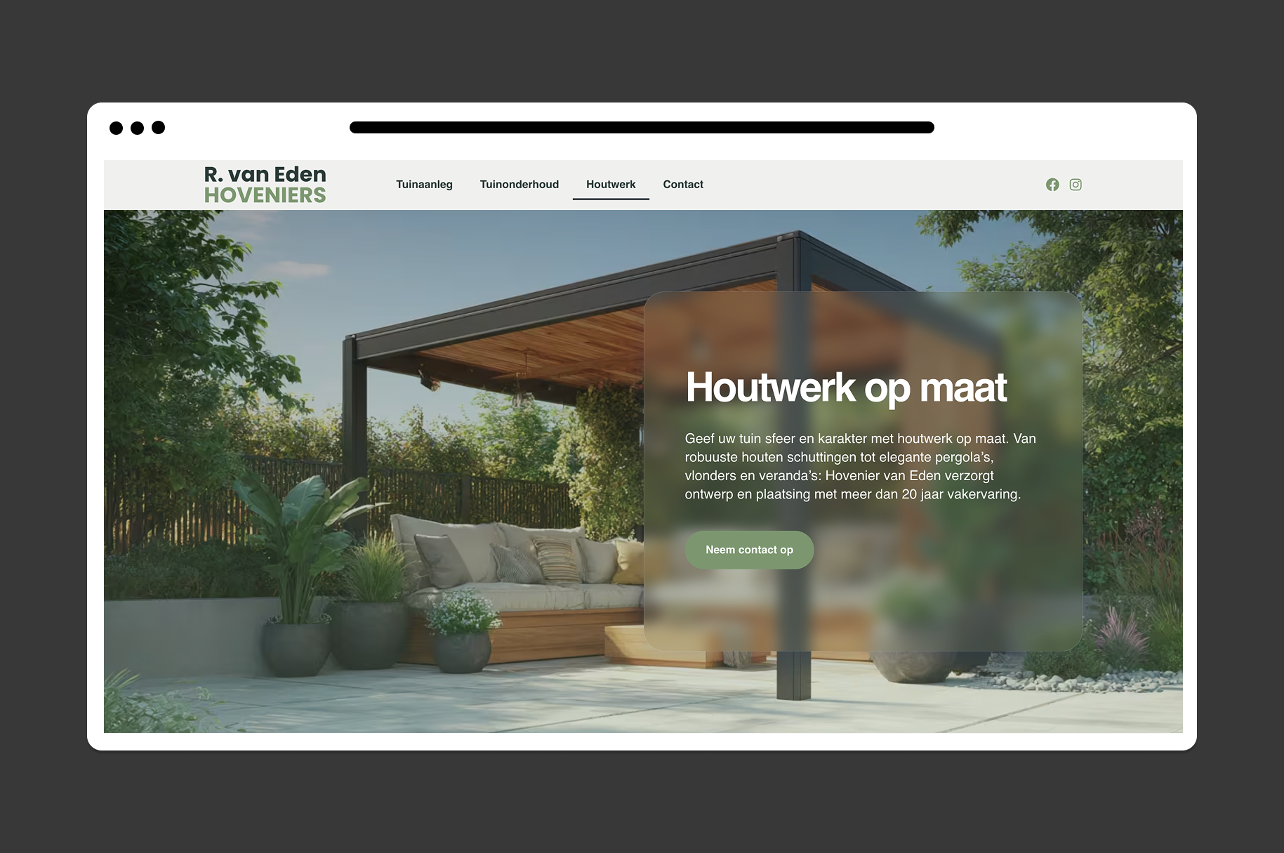 R. van Eden is een hovenier met passie voor tuinaanleg, onderhoud en houtwerk. Het bedrijf bedient particulieren en kleine bedrijven in de regio Delft. De oude website gaf alleen niet een goed beeld van hun vakmanschap. Het design oogde verouderd, de structuur was onduidelijk en aanvragen via de site bleven uit. Voor een bedrijf dat sterk leunt op vertrouwen en uitstraling was dat een groot gemis.